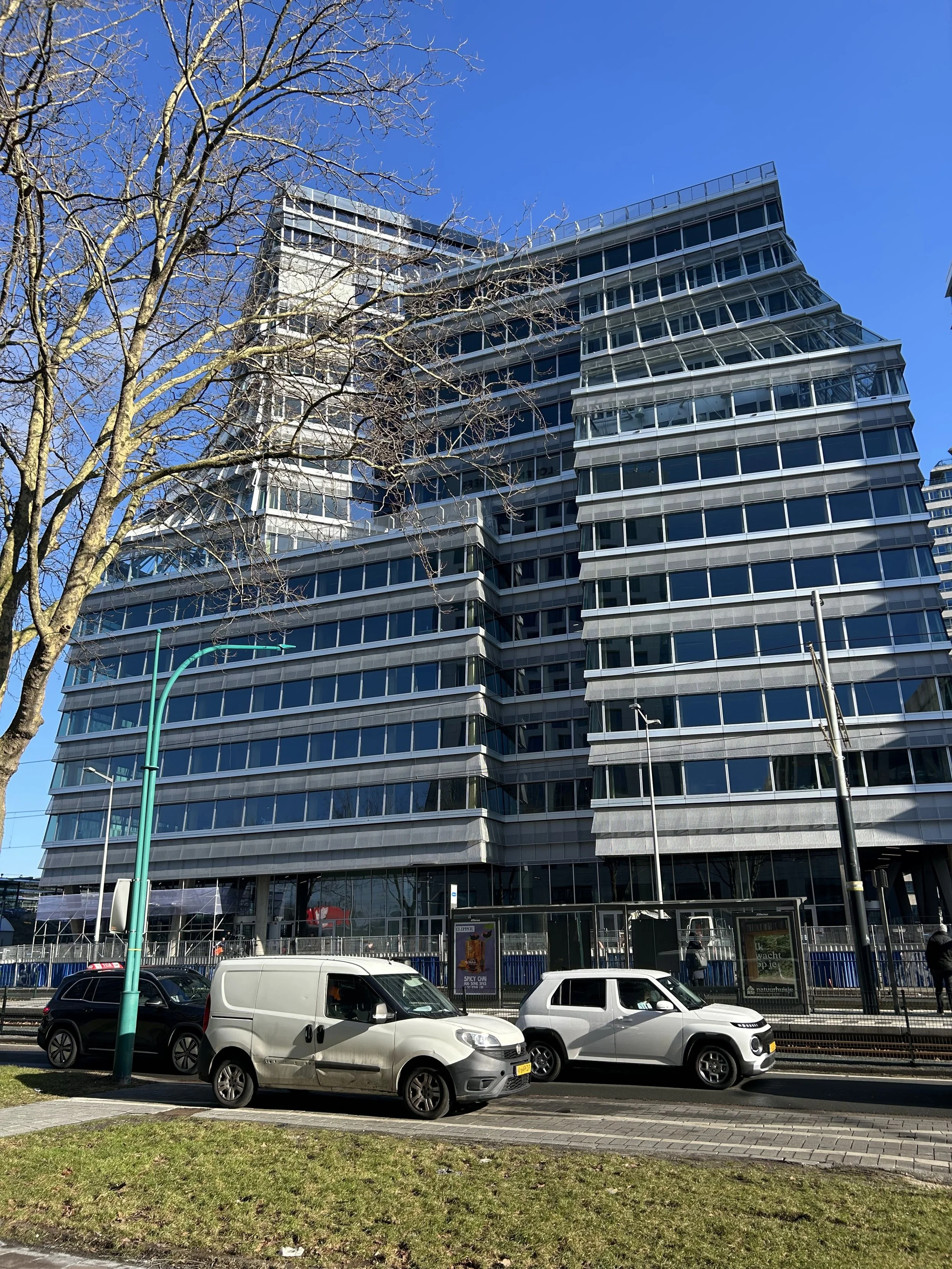 Dat neemt niet weg dat de kantoren, de binnenkant dus, uitnodigend zijn met veel ruimte voor werkcellen, boardrooms, ontmoetingsplekken, besloten en open zitjes. Het begrip kantoortuin kan bij het vuilnis. Overal treedt een prachtig uitzicht binnen, en dat mag een wonder heten in zo’n vol bebouwd stuk stad. Met helder weer is zelfs Utrecht zichtbaar.