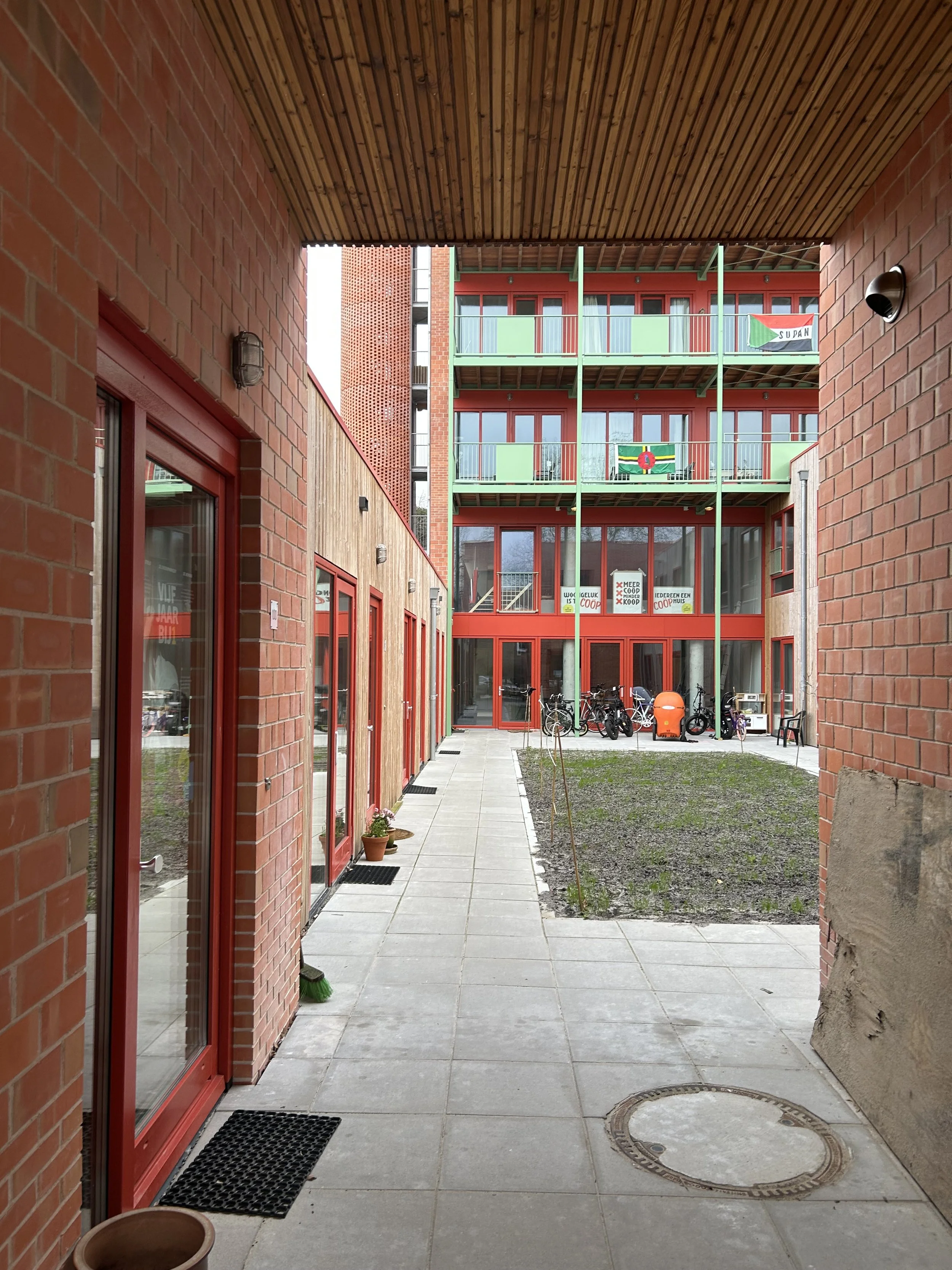 Post-kapitalistisch, dat is volgens architect Andrea Verdecchia de passende term voor het project De Nieuwe Meent. Maar het zou evengoed idealistisch, anarchistisch of utopisch genoemd kunnen worden. En in ieder geval activistisch, net zoals de levensvisie van de bewoners. Het hoeft geen verbazing te wekken dat er Free Palestine-borden bij de voordeur staan en een vlag met Sudan op het balkon.